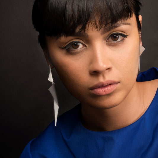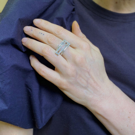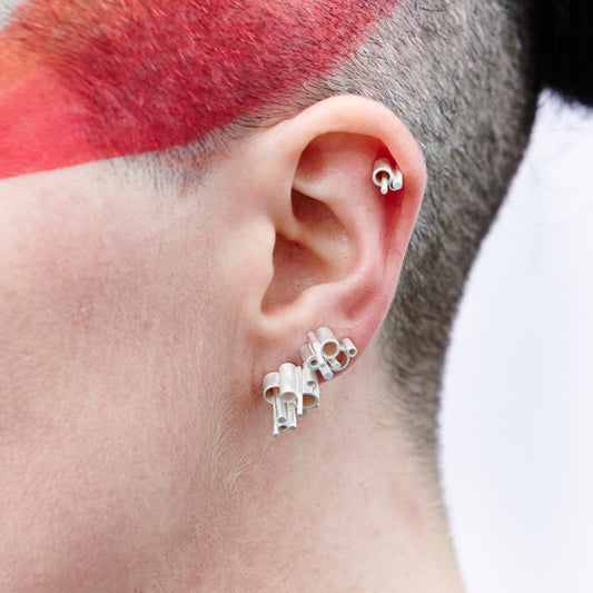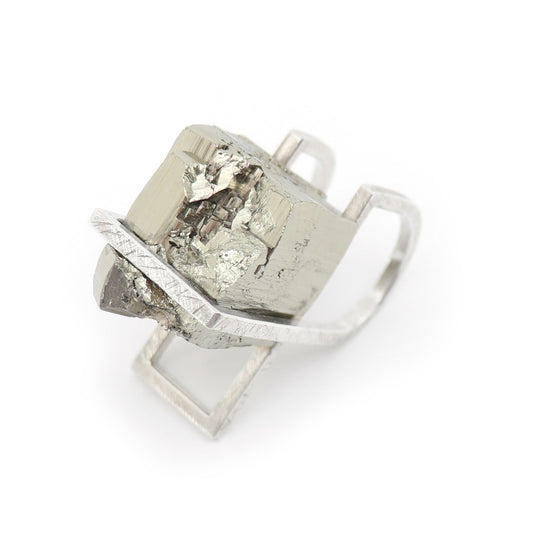 The Entrapment Collection is a bold exploration of movement within structure — where the clean lines of geometric form meet the unpredictable beauty of natural erosion. Inspired by urban architecture and contemporary design, each sculptural piece is handmade in eco-conscious sterling silver and features striking pyrite stones.